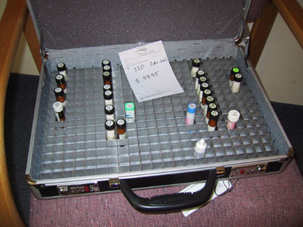 This briefcase is about 17 x 13 x 4 inches. Accommodates over 300 2 dr. vials. We used to sell them, but cheaper varieties are made in China and quality is completely unpredictable. On the other hand, better quality expensive models appear to be too pricy for the homeopathic community. If you have a briefcase you like, we can outfit it with grids for only $50.00. Or just order the grids and do it yourself. This is great for a mobile homeopath! By the way, old silverware boxes work well too! |